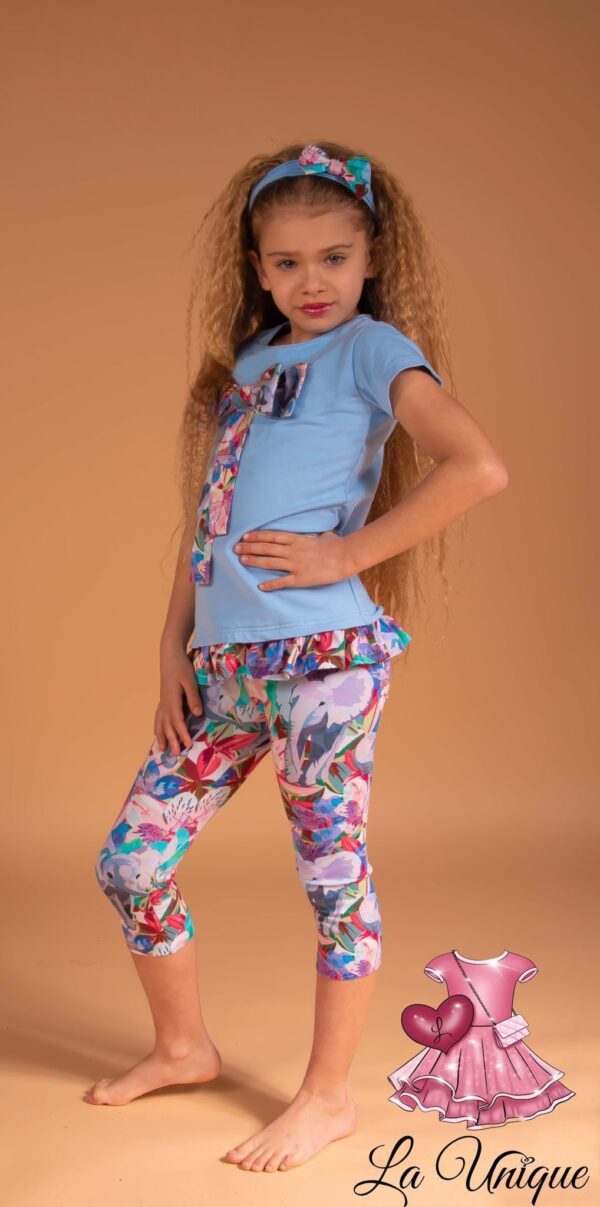 La-Unique Bleu Eliphant legging set in de kleur blauw . Afgewerkt met grote strik aan de voorkant. Met bij passende haarband of scrunchie deze zijn los te bestellen van La-Unique.